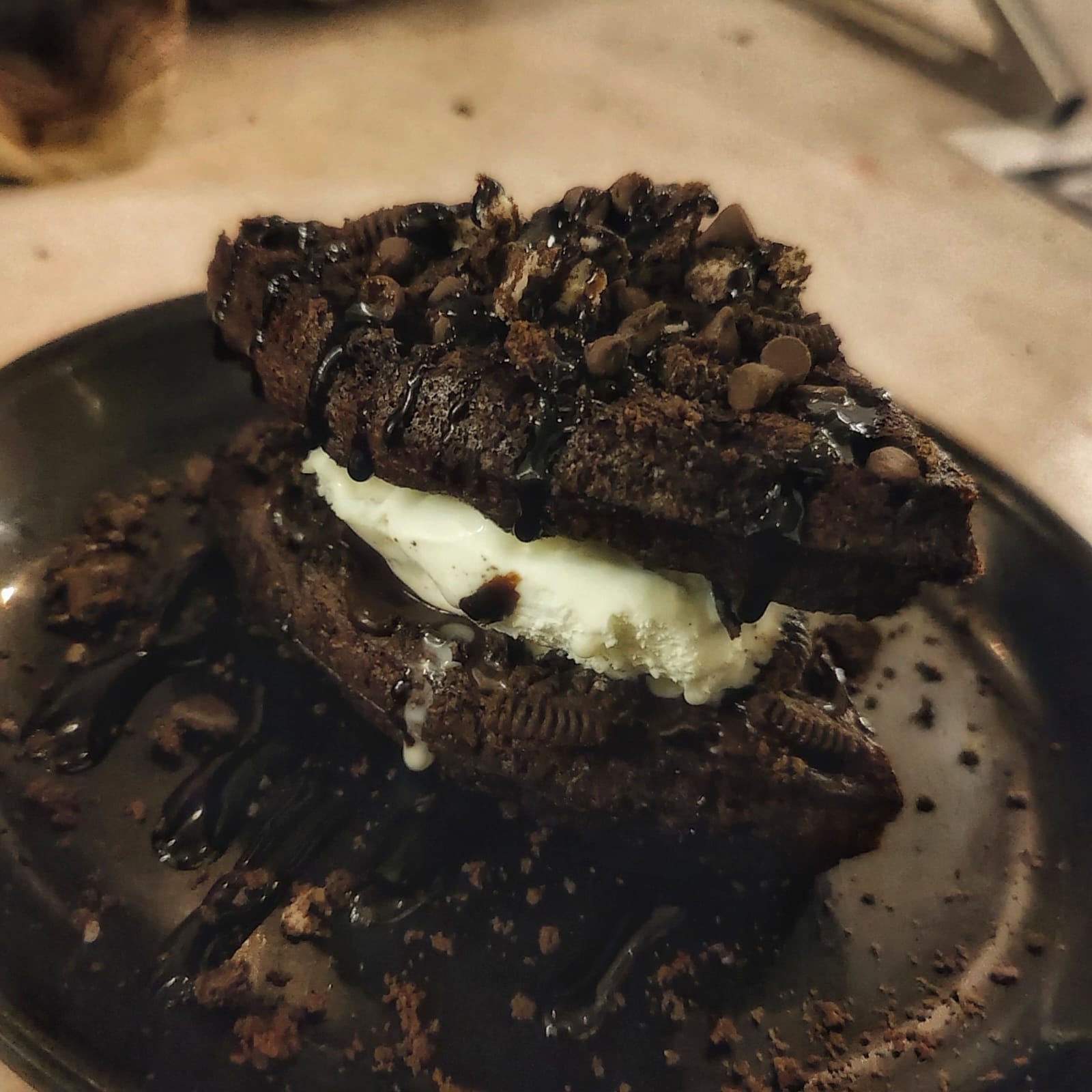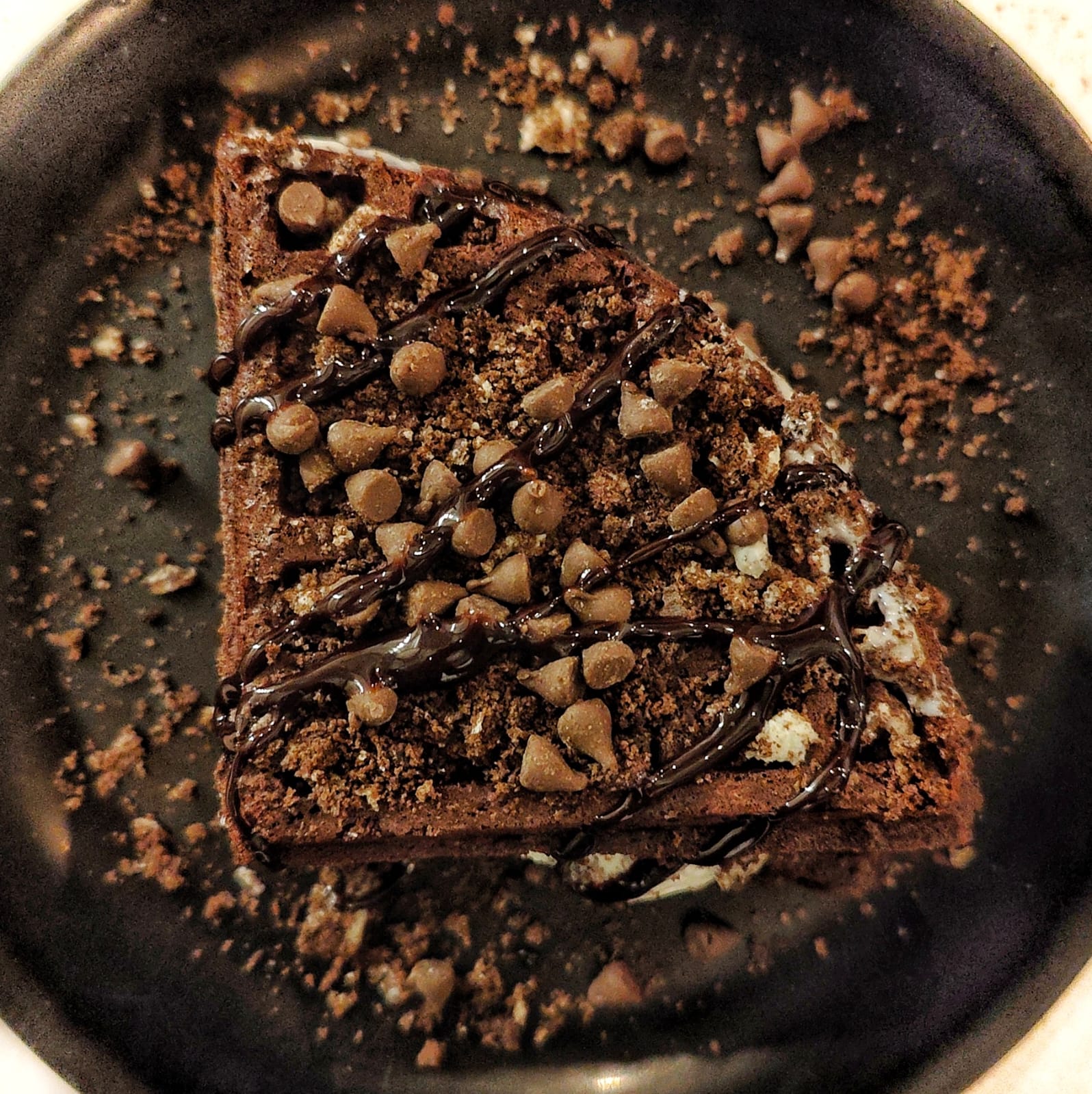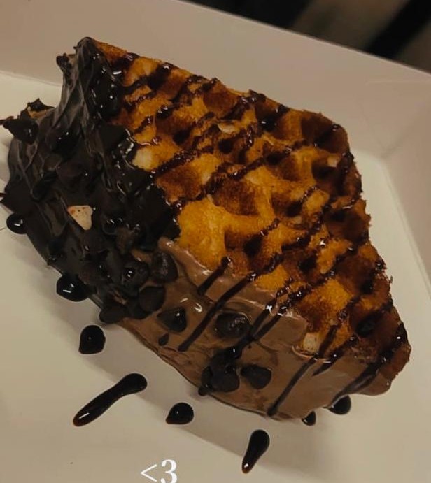 A rich cocoa-infused waffle loaded with creamy milk chocolate chips, topped with a drizzle of luscious chocolate sauce, and finished with a sprinkle of chocolate crumble for that perfect melt-in-your-mouth indulgence.