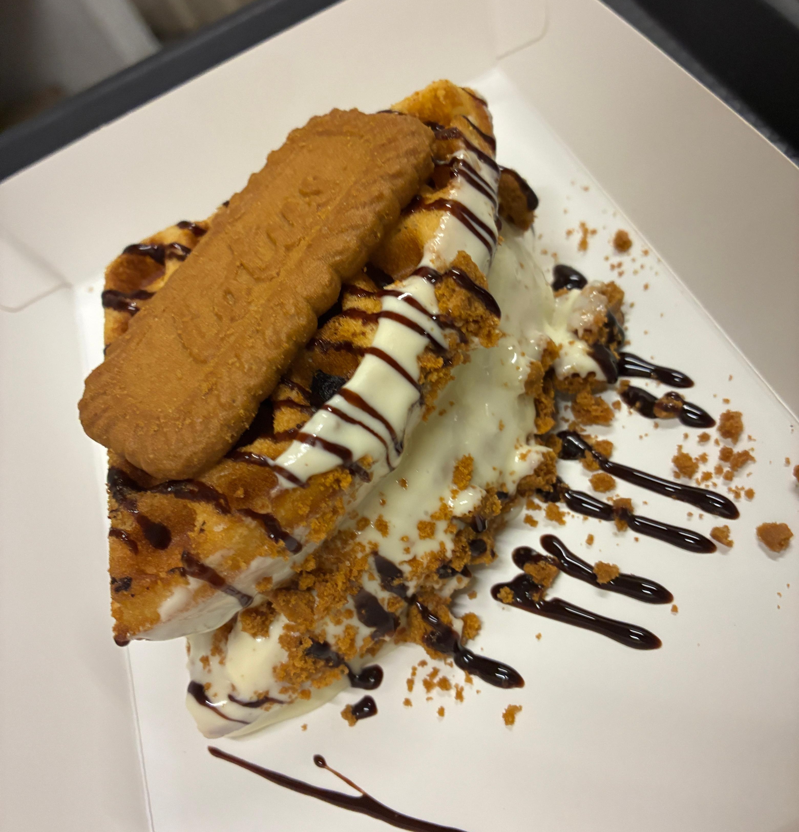 Golden, fluffy waffle layered with creamy white chocolate, drizzled with rich chocolate sauce, topped with a crunchy Lotus Biscoff biscuit, and sprinkled with caramelized Biscoff crumbs for the ultimate sweet crunch.