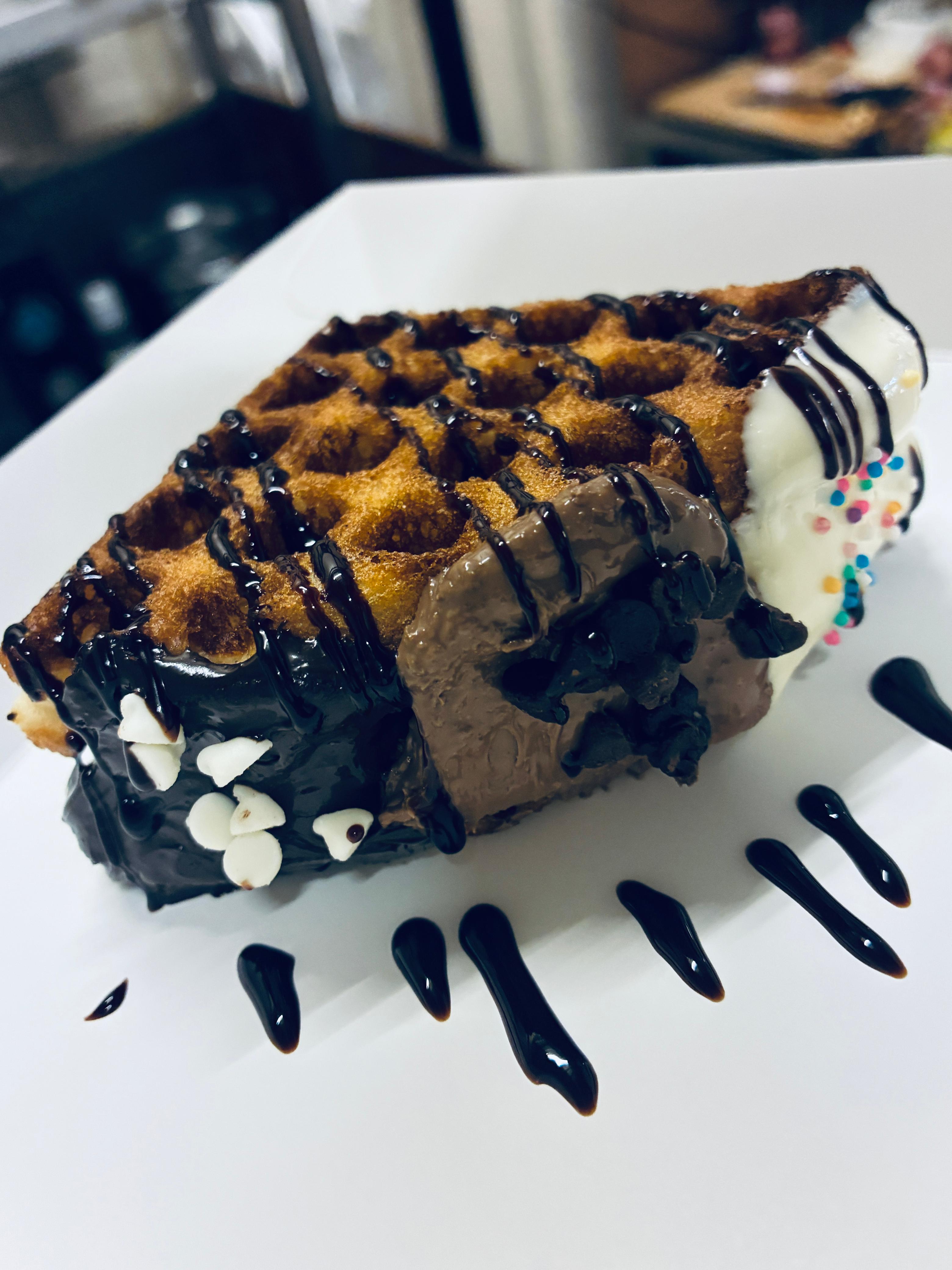 A rich cocoa waffle loaded with velvety milk chocolate and bold dark chocolate, drizzled generously for a perfect balance of creamy sweetness and deep cocoa intensity.